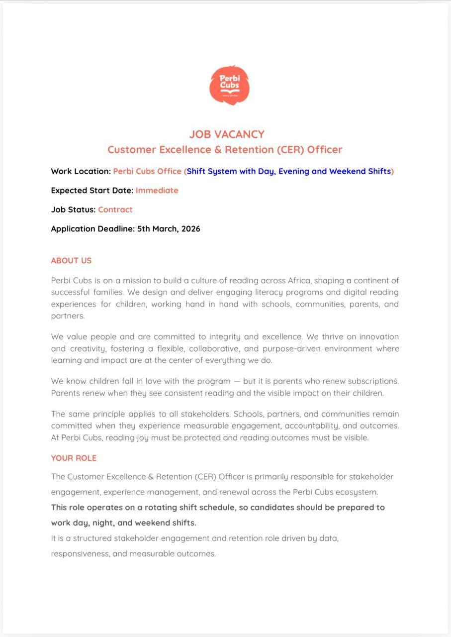 Work Location: Perbi Cubs Office (Shift System with Day, Evening and Weekend Shifts) Expected Start…