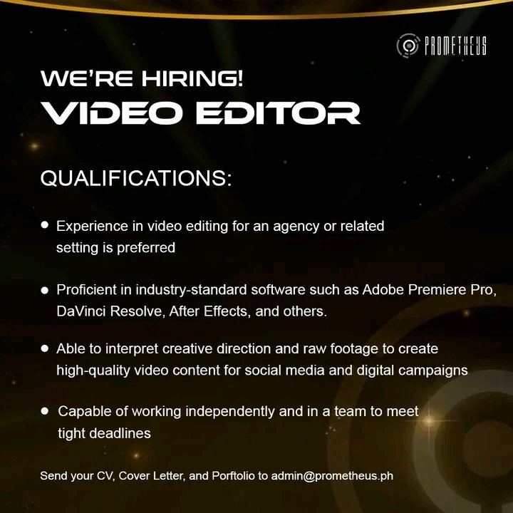 PROMETHEUS IS HIRING VIDEO EDITOR QUALIFICATIONS: . Experience in video editing for an agency or…