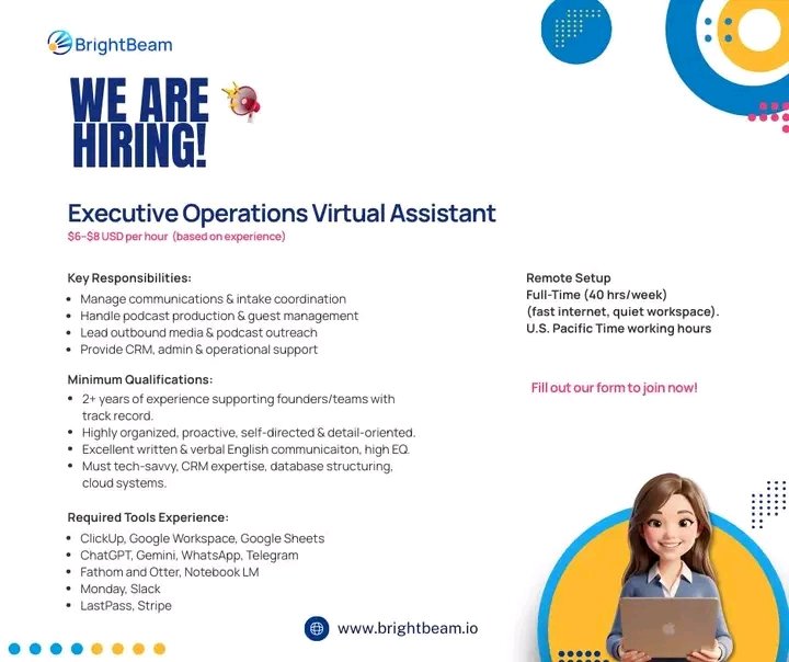 Hiring: Executive Virtual Assistant $6-$8 per hour | Full time Firm: BrightBeam We help e-commerce…