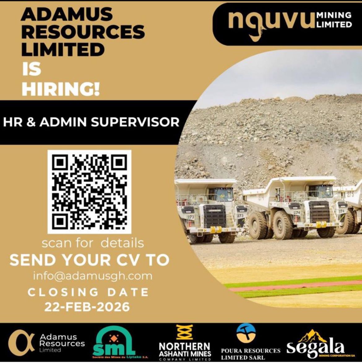 ADAMUS RESOURCES LIMITED IS HIRING! HR & ADMIN SUPERVISOR scan for details SEND YOUR CV…