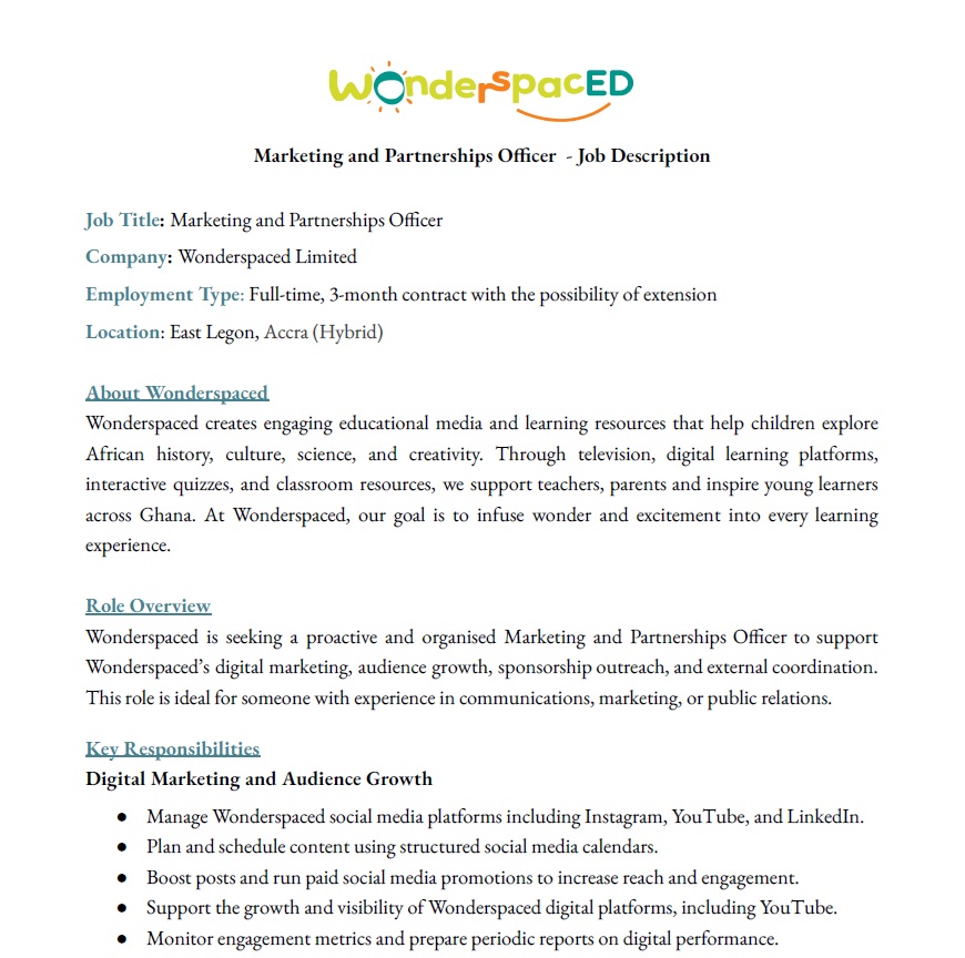 Job Title: Marketing and Partnerships Officer Company: Wonderspaced Limited Employment Type: Full-time, 3-month contract with…
