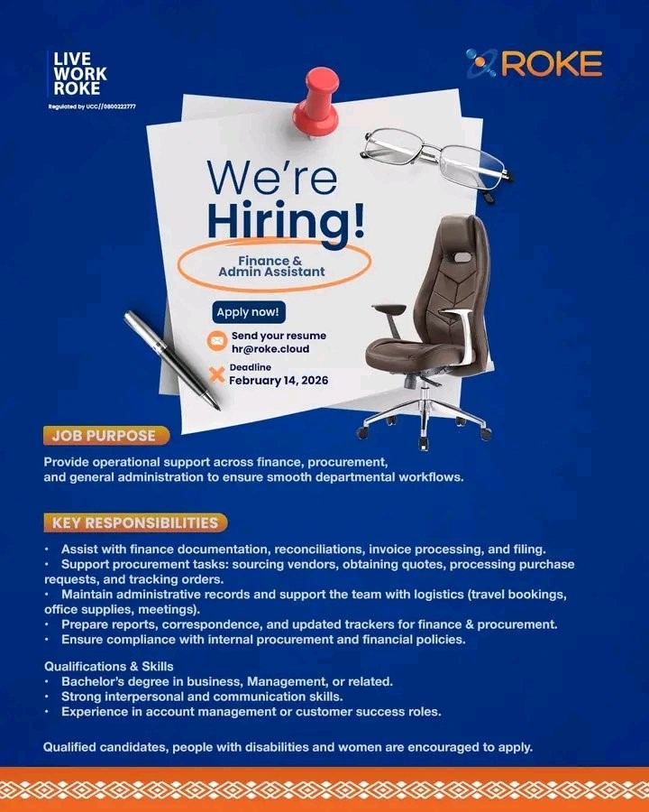 Hiring! Finance &Admin Assistant Apply now! Send your resume hr@roke.cloud Deadline February 14, 2026 JOB…